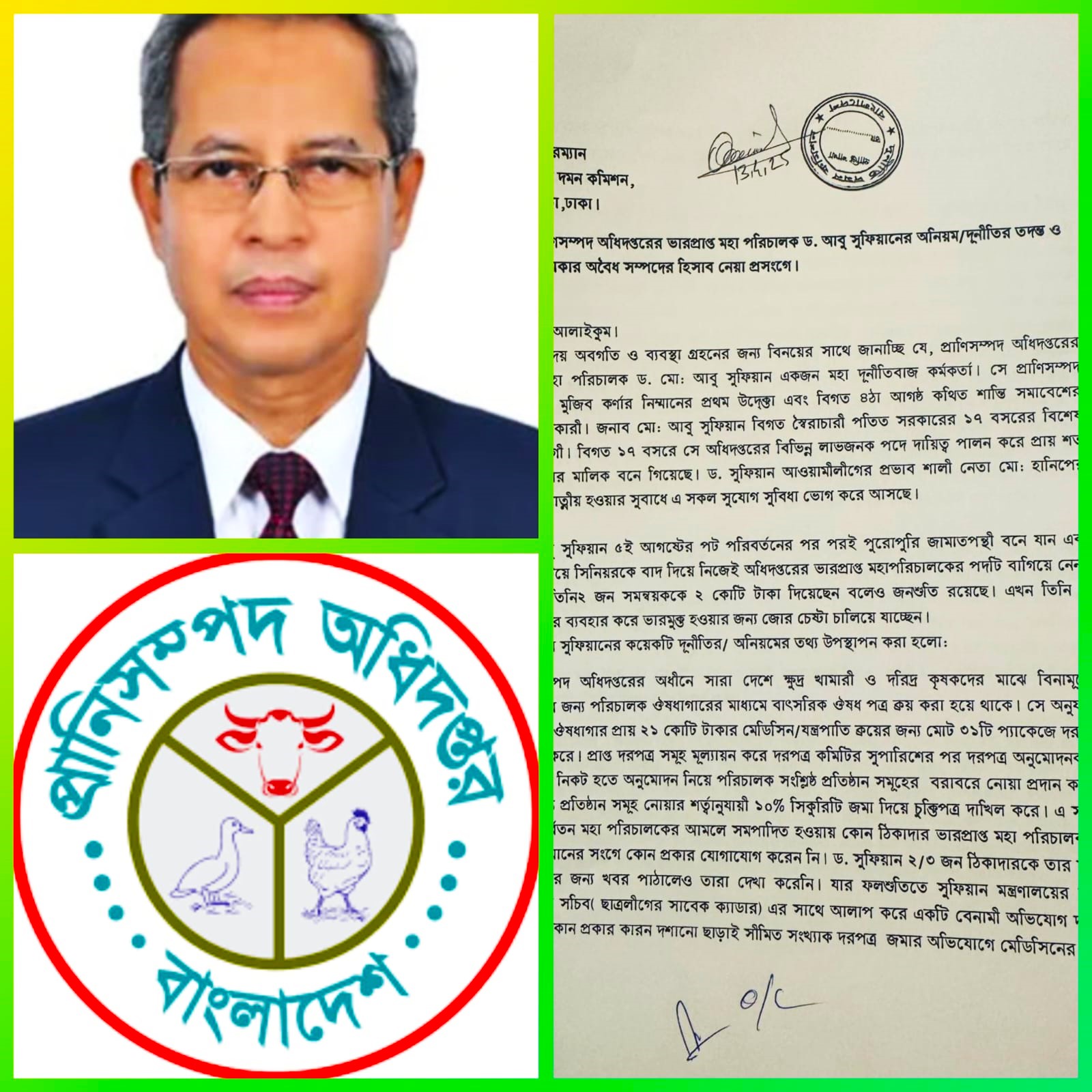 প্রাণিসম্পদ অধিদপ্তরের ভারপ্রাপ্ত মহাপরিচালক ড. মো. আবু সুফিয়ান এর বিরুদ্ধে দুর্নীতি দমন কমিশনে ১২ দফা দুর্নীতির লিখিত অভিযোগ জমা পড়েছে।